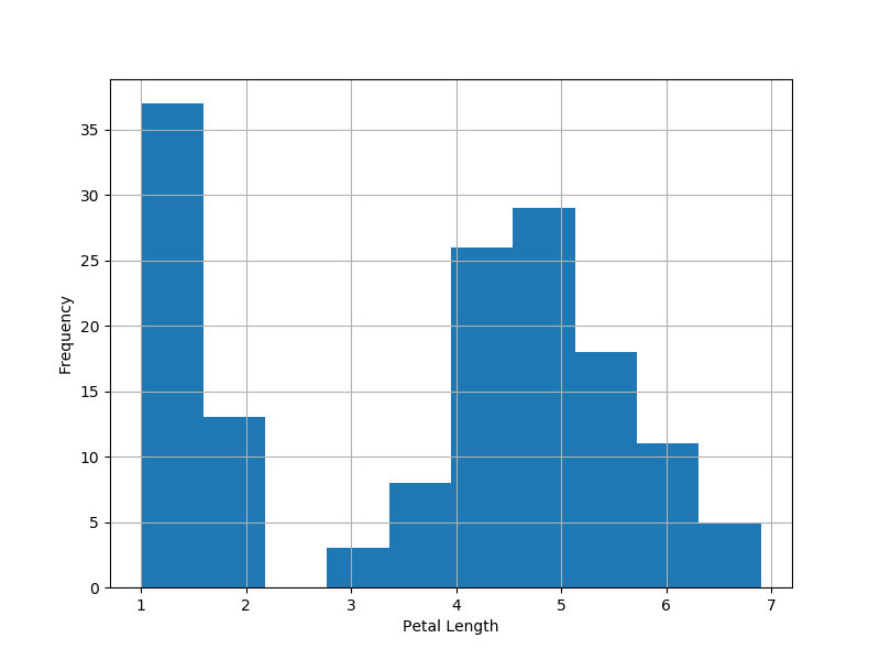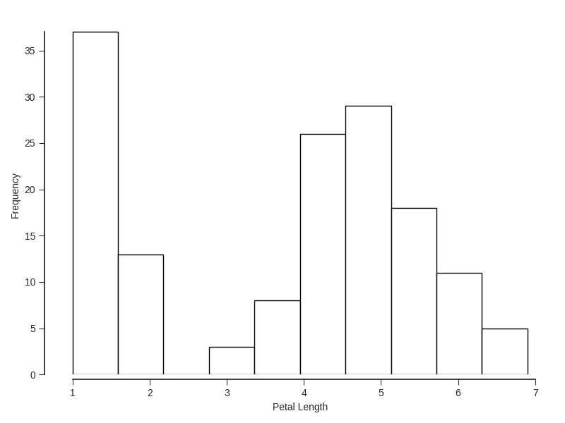 Rhist(df.petal_length, xlab = "Petal Length", savename = '../files/site_pics/Rhist_R_default.png')